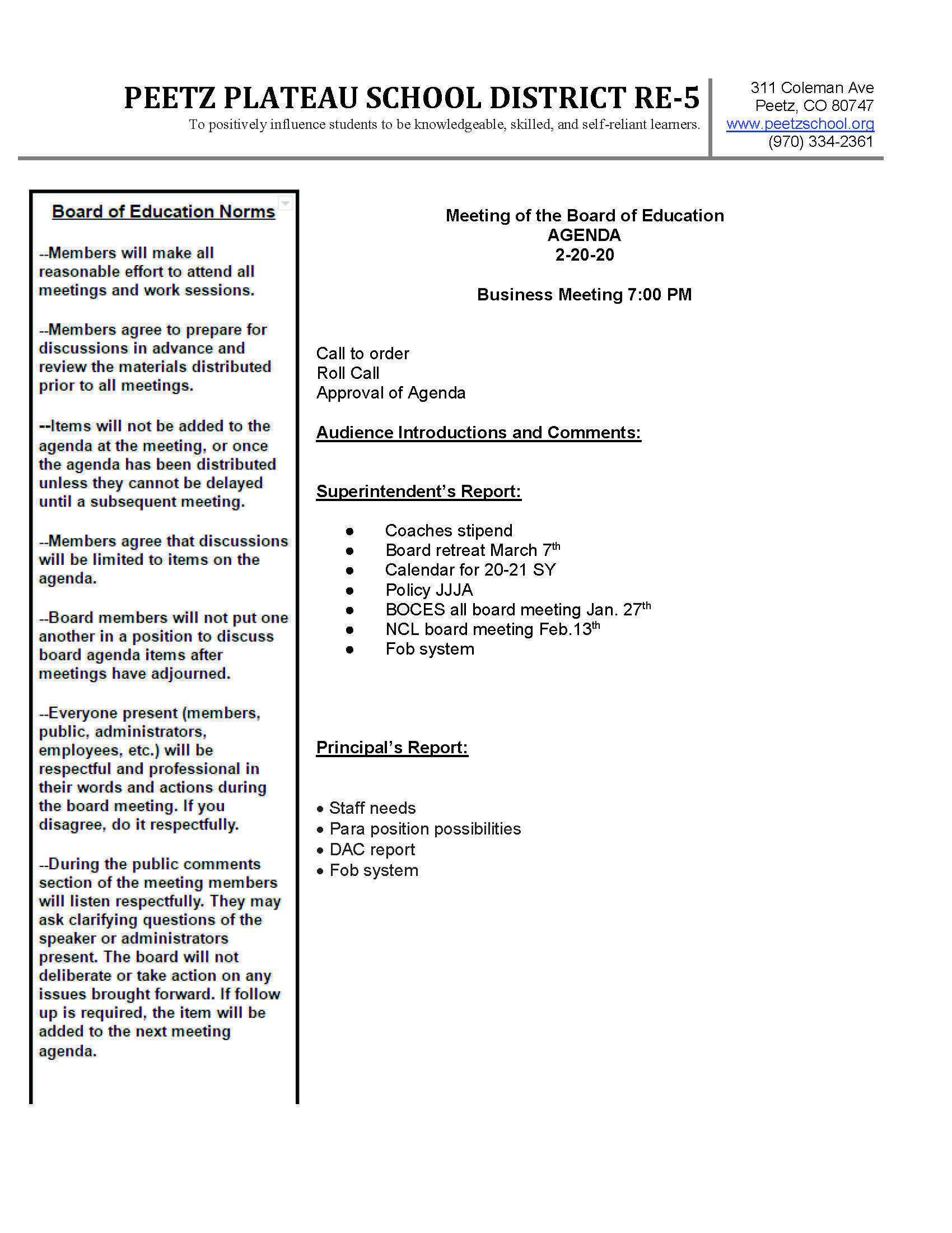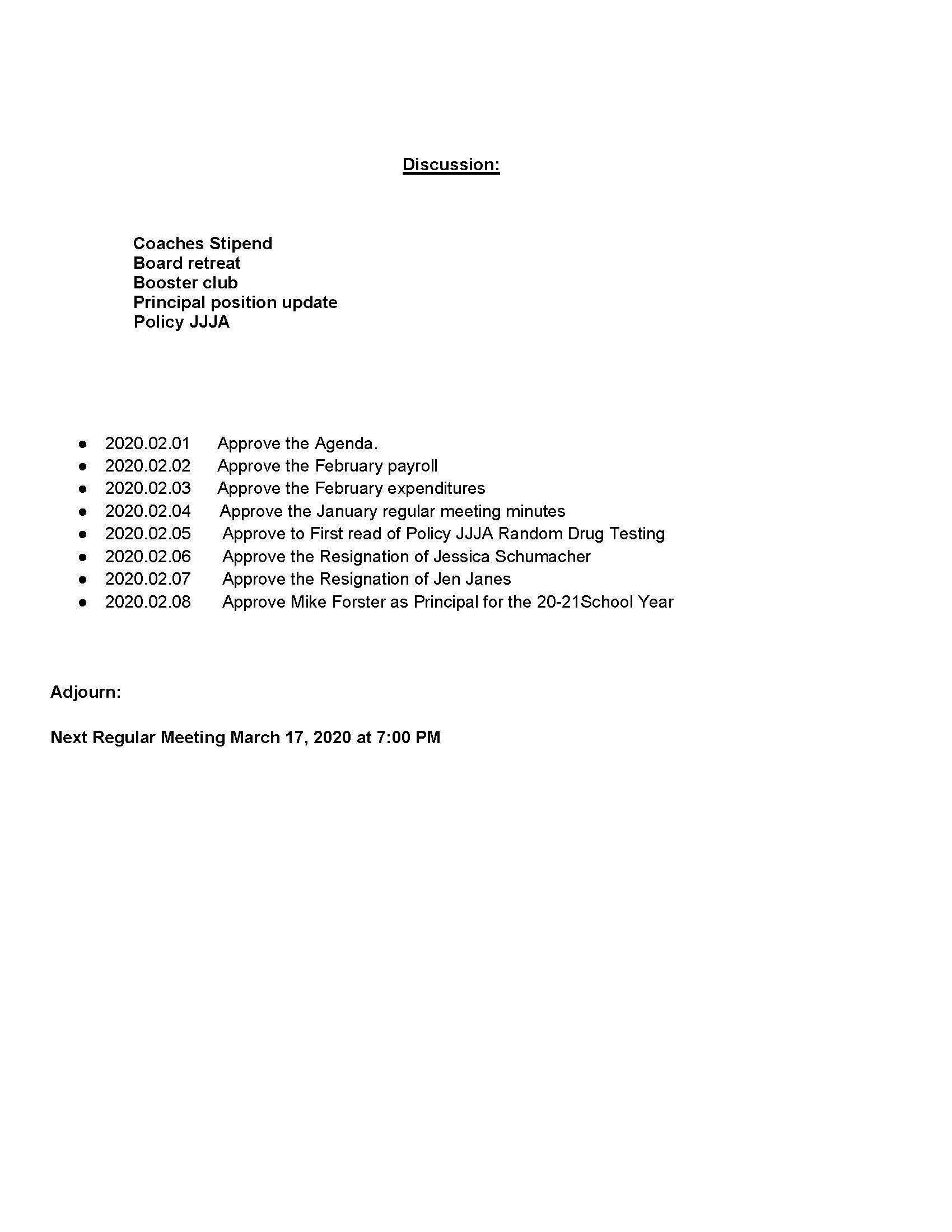 School Board meeting is set for Thursday, February 20th at 7:00pm. Board Meetings are in the room right next to the office (down the stairs). The public is always welcome.
