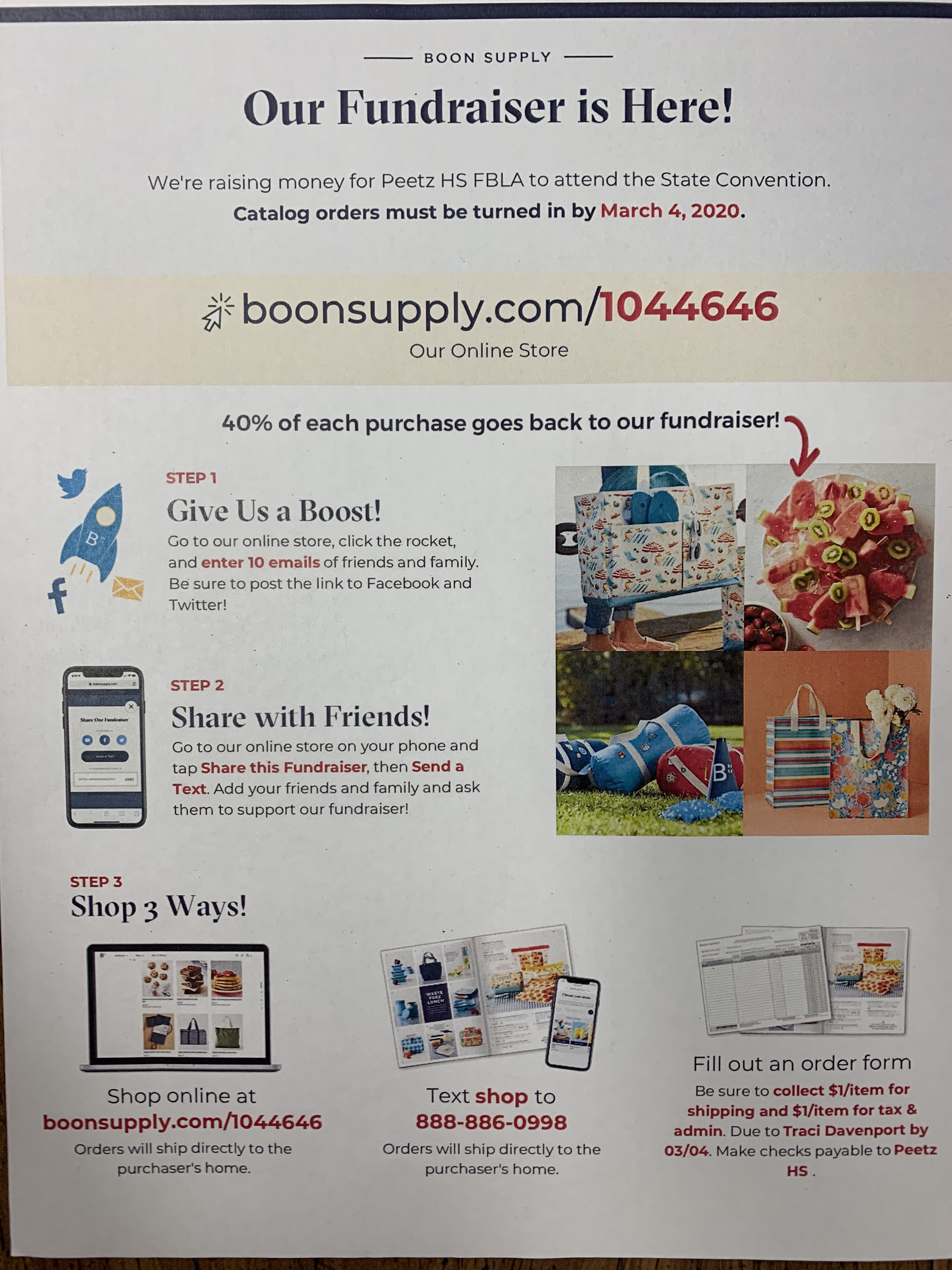 There is something for everyone within the Boon Supply Spring 2020 catalog. From baked goods all the way to quality summer totes and kitchen utensils, there is bound to be something to catch your eye. By taking part in the purchase of some of these quality items, you will be helping send the entire Peetz FBLA chapter to their state competition in April where they will be competing against other FBLA members from across the state to hopefully secure a spot at the National FBLA competition.