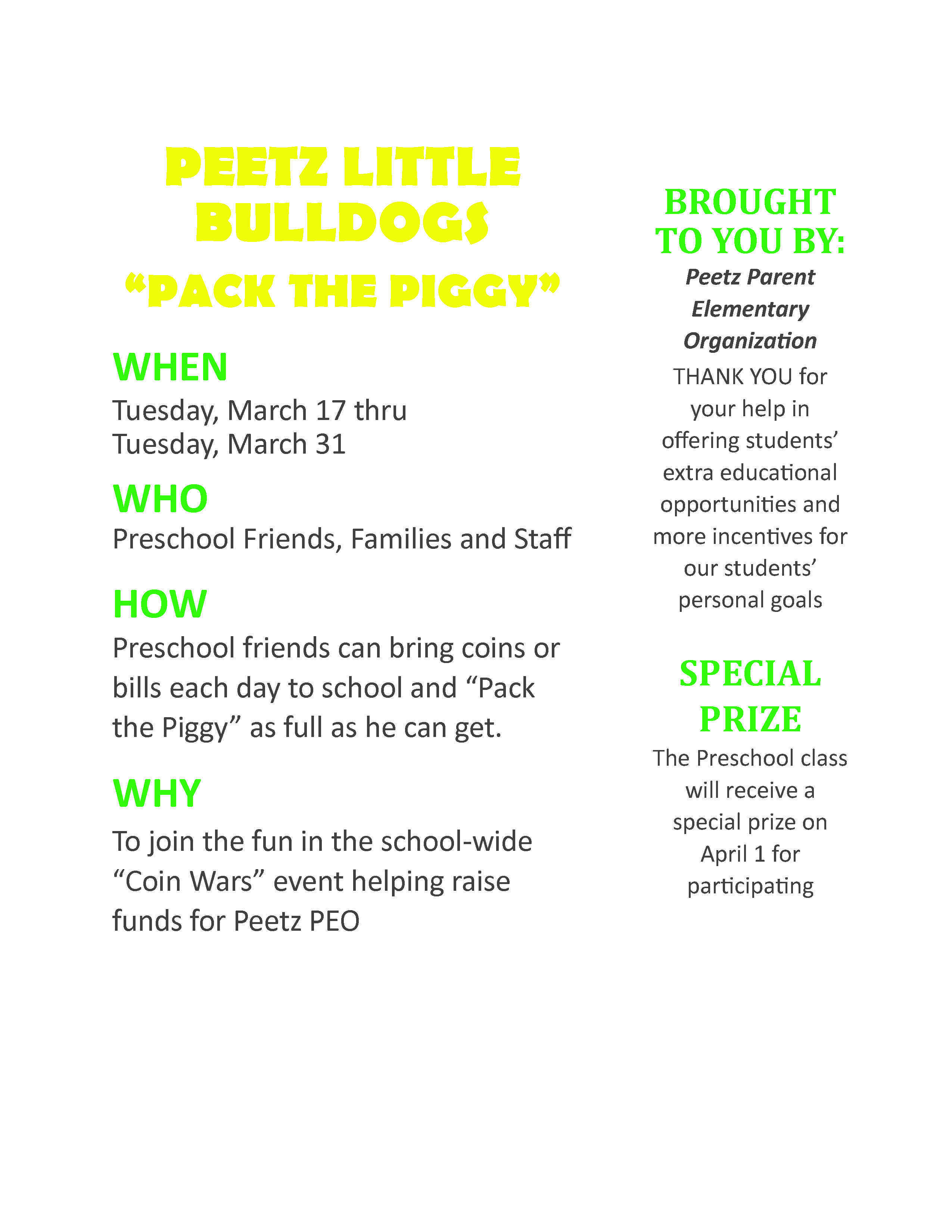 Peetz Parent Elementary Organization (PEO) is excited to introduce the 1st Annual Bulldog Coin Wars coming March 17 and running through March 31.