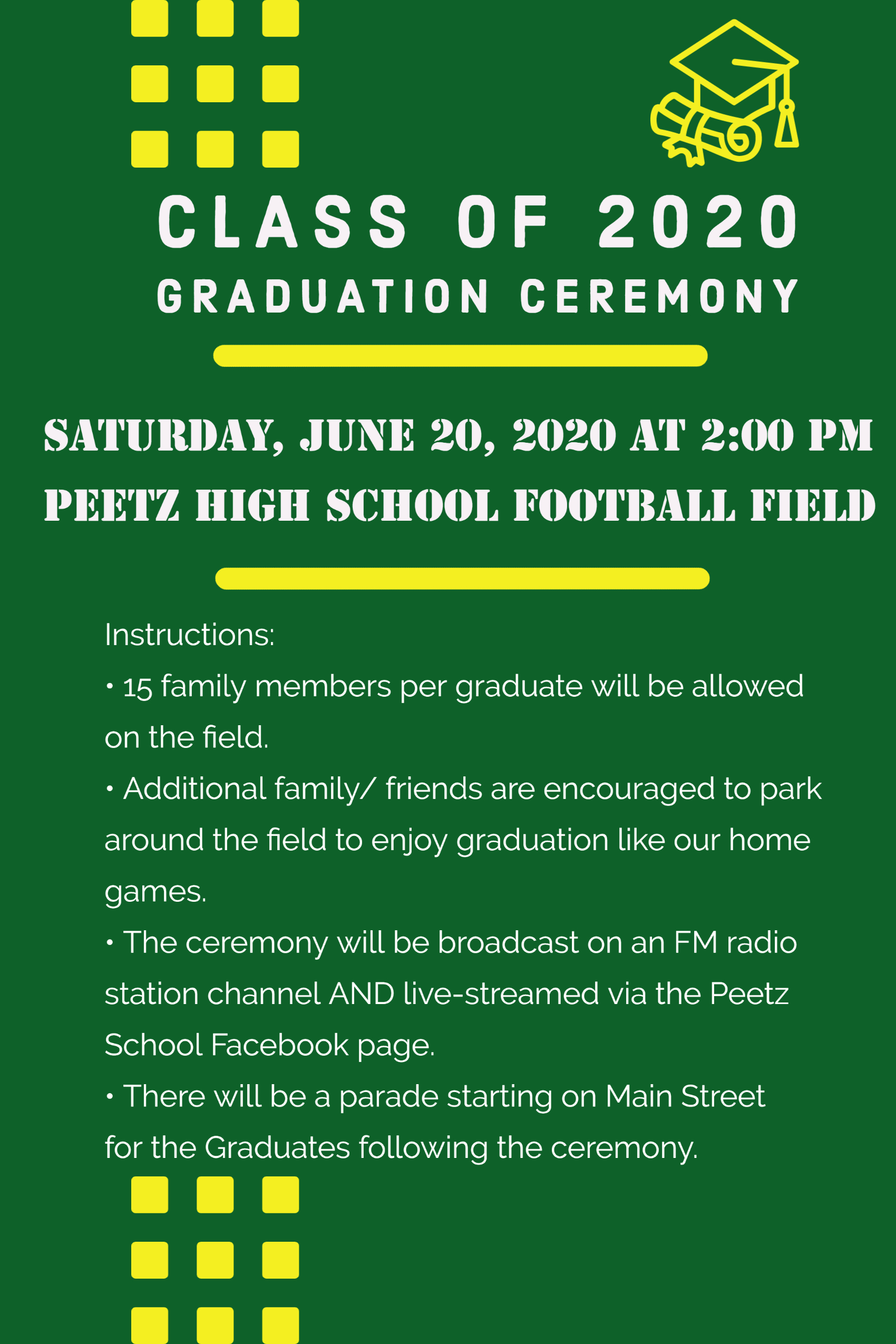 Peetz School’s Graduation and Continuation will look different this year, regardless; we are excited to honor our graduates and those students moving into high school. Due to CDC recommendations from the State and Local levels, both ceremonies will be limited in regards to number of attendees. We understand the need to celebrate these momentous occasions with family and friends, but we also realize the need to keep our students, families, and community safe as we share in these two events. Peetz School will be hosting the two ceremonies at different times on June 20th in order to meet the limitations on numbers at events and allow adequate time to clean and prepare for Graduation. The limited number of family/ friends invited by the student will be allowed to view the ceremonies from the football field. Those family/ friends that are unable to be located on the field may view the ceremonies parked around the field as is typically done when watching a home football game. Additionally, you may park in the dirt lot located between the school and the baseball field. All those that are viewing from their vehicles must REMAIN in their vehicles during the ceremonies. We will broadcast the ceremony with the use of an FM transmitter and live-streaming the ceremonies on the Peetz School Facebook page. For community members that wish to celebrate the Graduates accomplishments there will be a “Parade of Graduates” following the Graduation ceremony. A big THANK YOU to the parents of the Class of 2020 for planning this fun addition for our seniors!