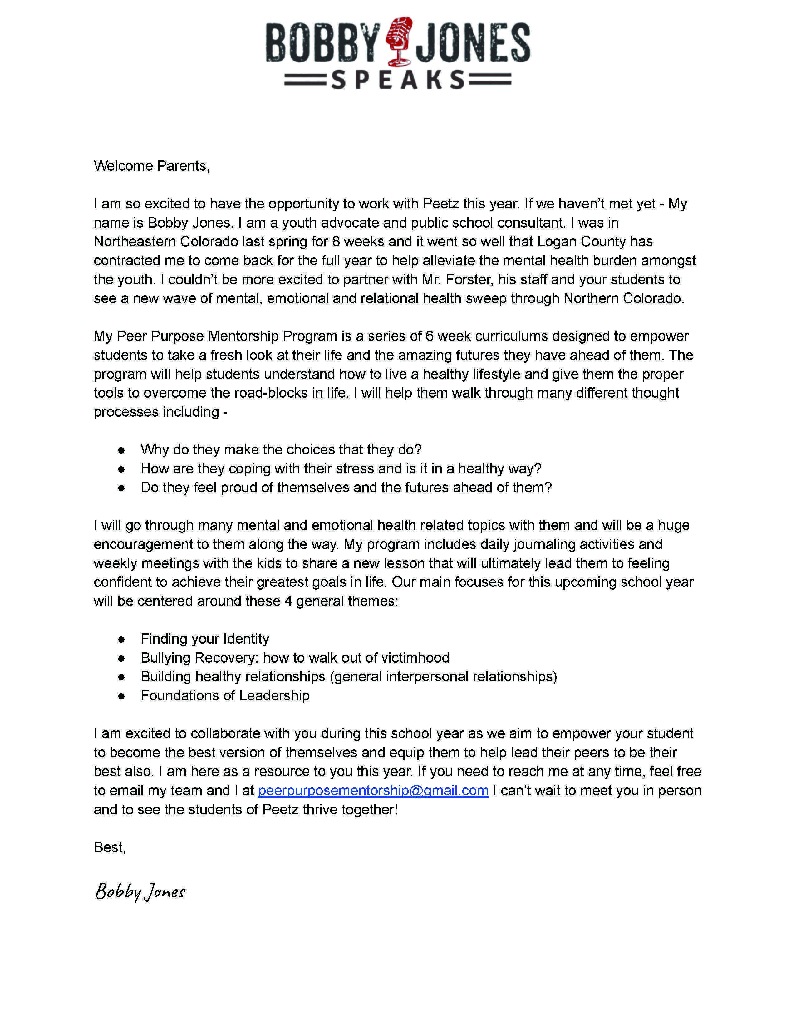 Finally, we invite all of you as parents and guardians of our secondary students to attend a parent meeting with Bobby next Tuesday night September 7th at 5:30 pm in the little gym. This will be a great opportunity to hear from Bobby firsthand about this program and to ask any questions you may have of him. Attached is a letter from Bobby Jones to all of you as parents, please take the time to read it and find out a little more information prior to the evening meeting next Tuesday.