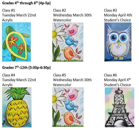 The Bulldog Benchwarmers and Georla Creations are offering painting classes for students 4th – 12th grade. Classes will be in the commons area at the school. Cost is $20 per class and includes all needed supplies, snack, and a whole lot of fun!